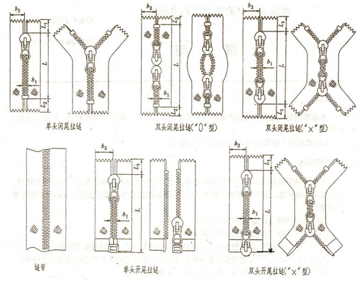 1.1、拉鏈按型式分為條裝拉鏈和碼裝鏈帶:條狀拉鏈可分為開(kāi)尾拉鏈和閉尾拉鏈;開(kāi)尾拉鏈又分為單開(kāi)尾拉鏈和雙開(kāi)尾拉鏈;閉尾拉鏈可分為單頭閉尾拉鏈和雙頭閉尾拉鏈;雙頭閉尾拉鏈可分為: