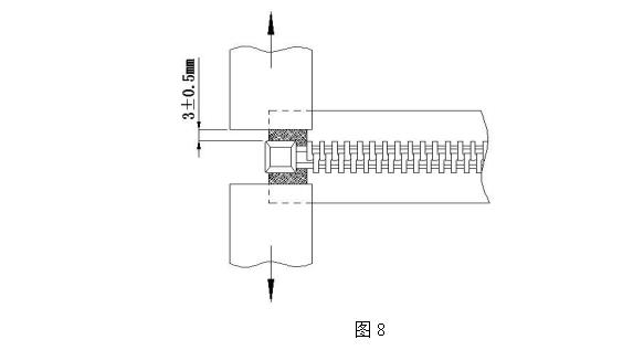 取長(cháng)度大于 50mm 帶分開(kāi)件的拉鏈樣本一段,將分開(kāi)件處裝夾在上述夾具中。裝夾時(shí)夾具邊緣必須與插銷(xiāo)的內側端(即靠近鏈牙一端)成一直線(xiàn),夾口靠緊插銷(xiāo)插座(如圖 8)。啟動(dòng)測試儀器,測試至分開(kāi)件相互脫離或者布帶破損為止,此時(shí)的強力值即為拉鏈開(kāi)尾平拉強力,采用多次測試取有效范圍值。